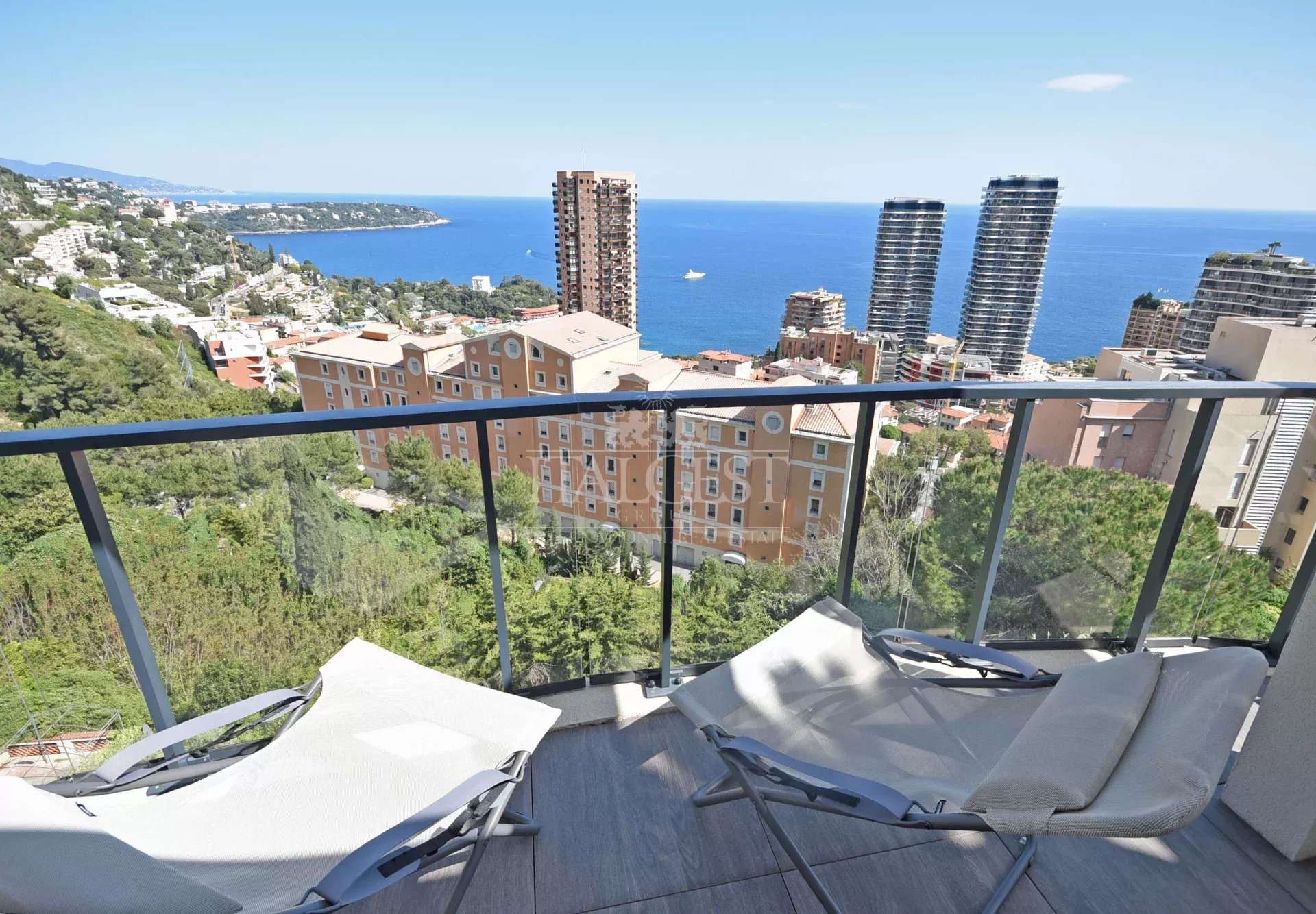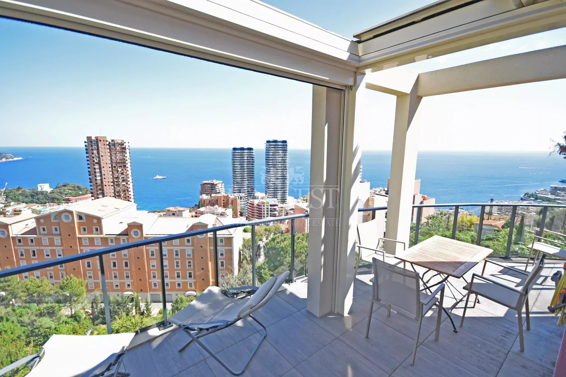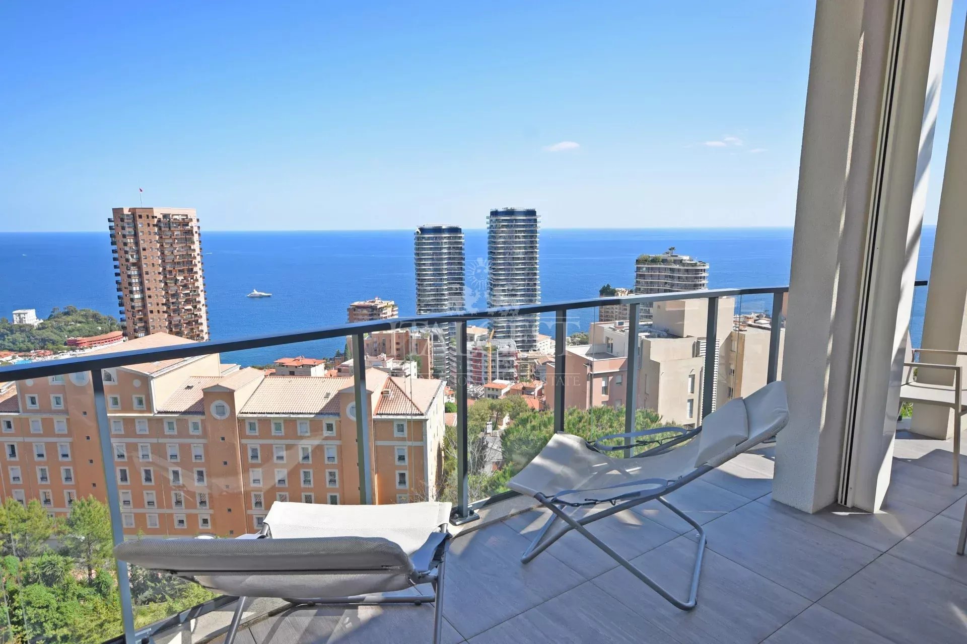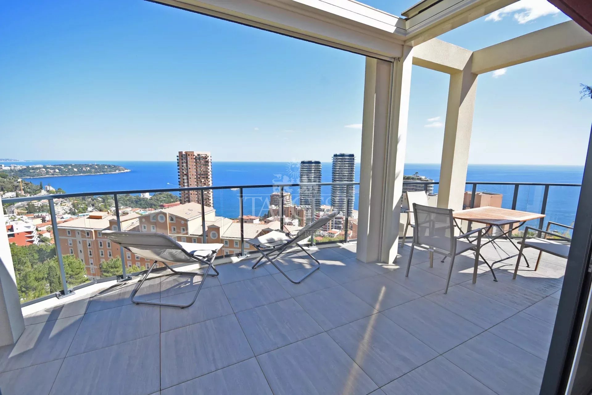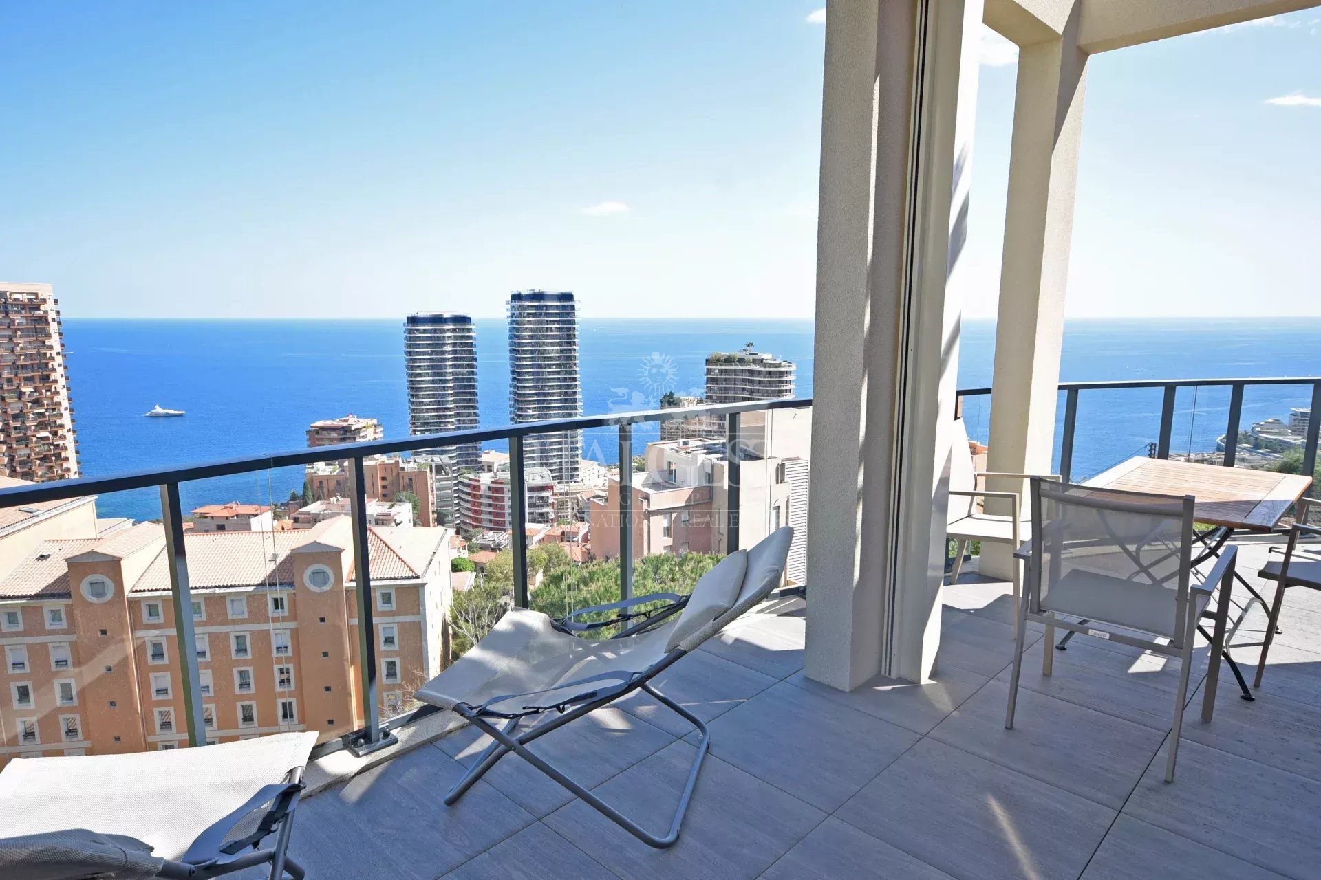 The modern apartment consists of a large corner living room with open-plan kitchen, large windows allowing panoramic views over Monaco and the sea, with access to the terrace, two bedrooms, two full bathrooms plus a guest WC. Air conditioning in every room, bioclimatic pergola on the terrace, two covered private parking spaces and a cellar.