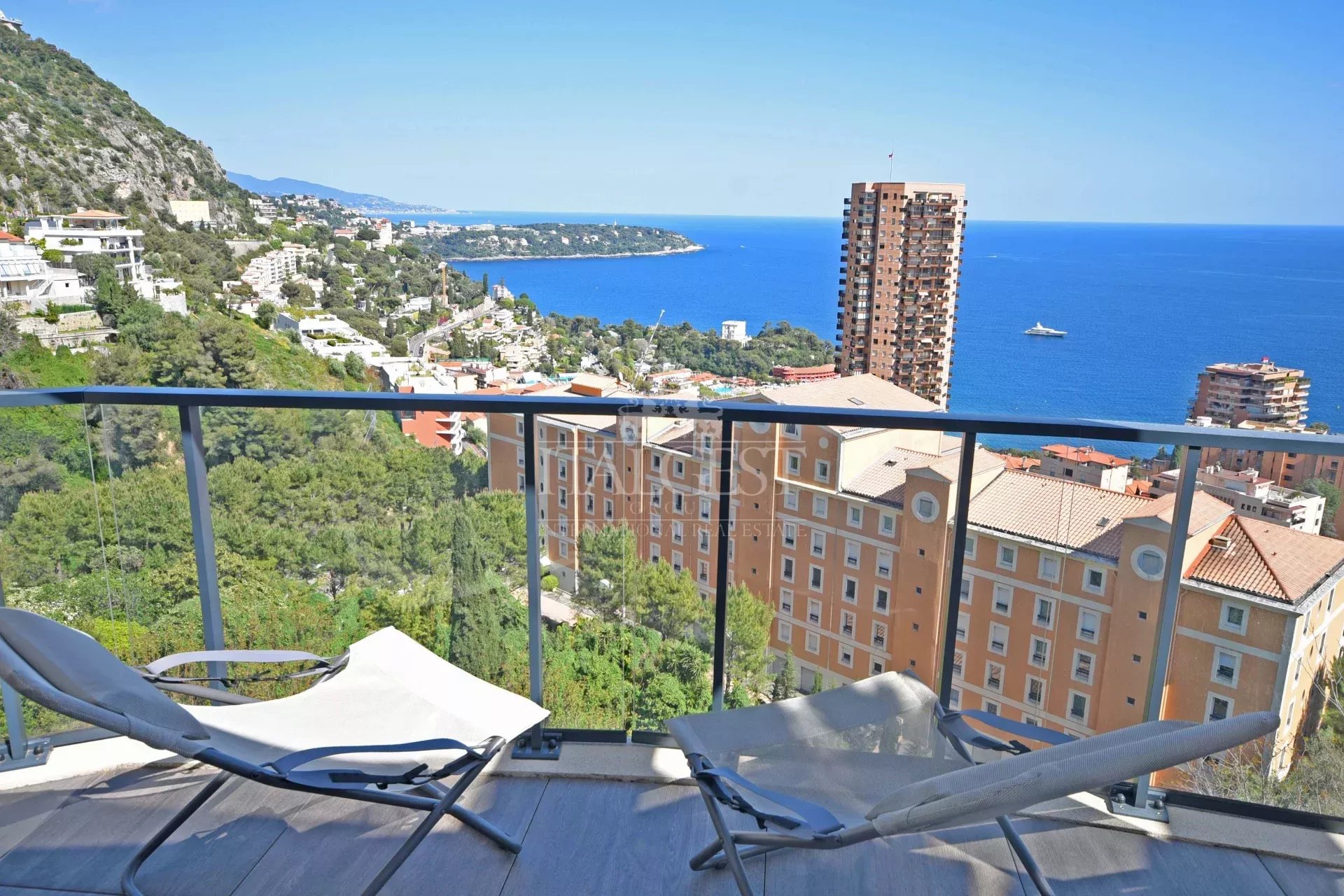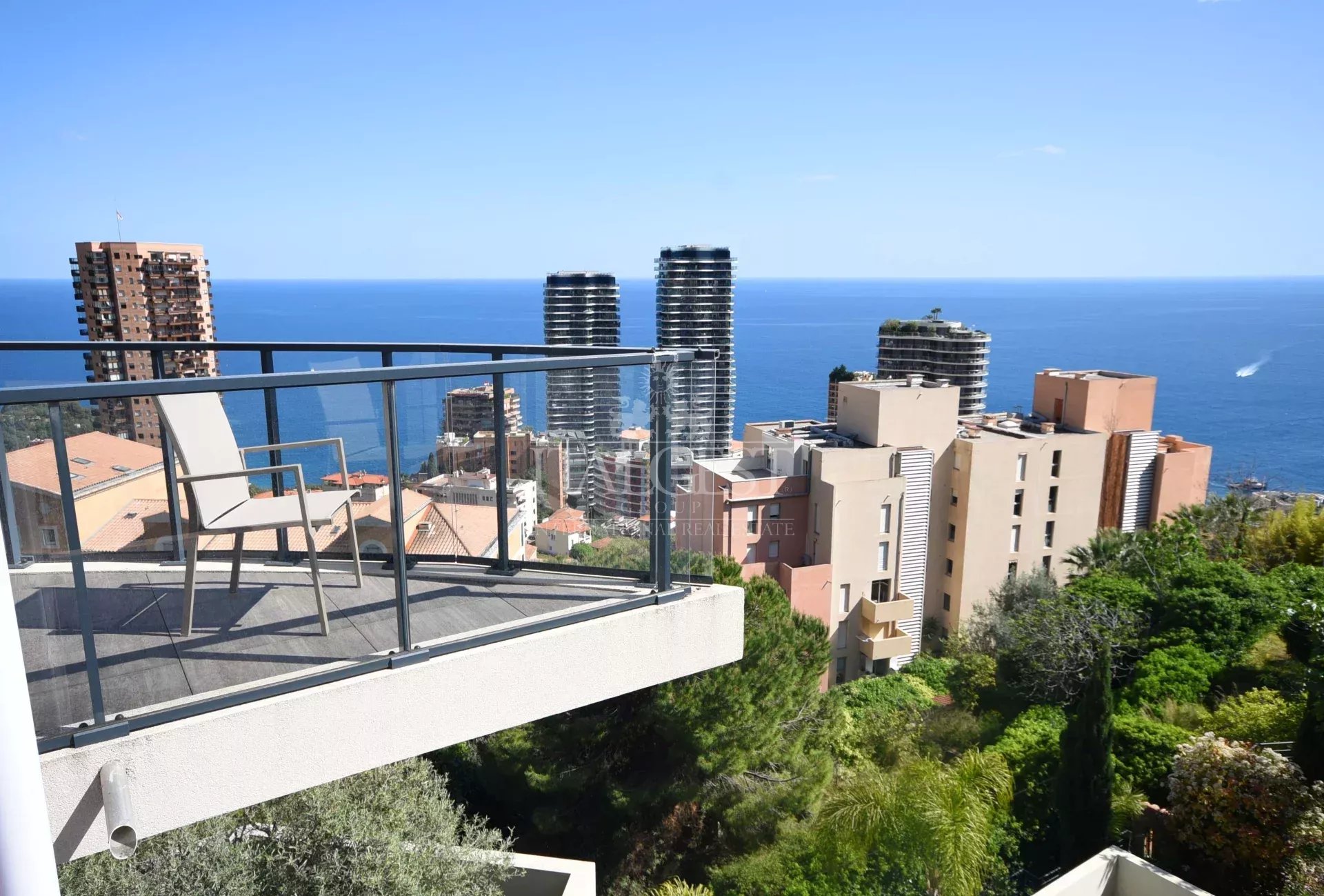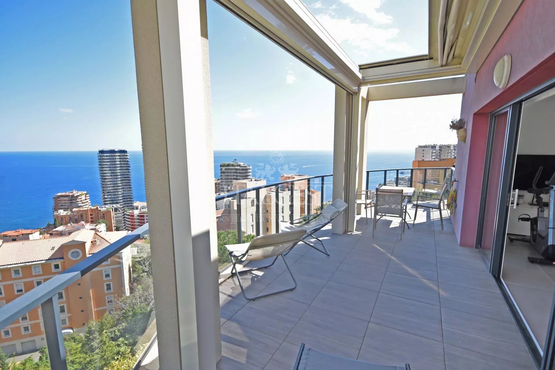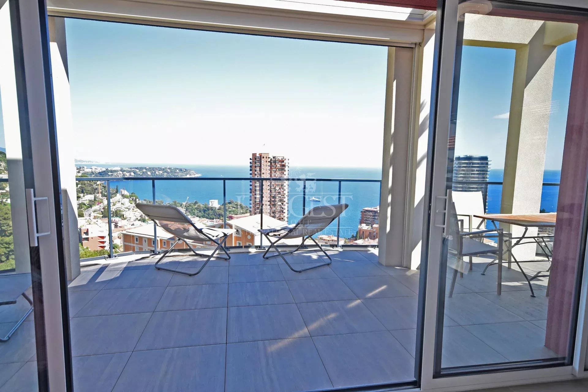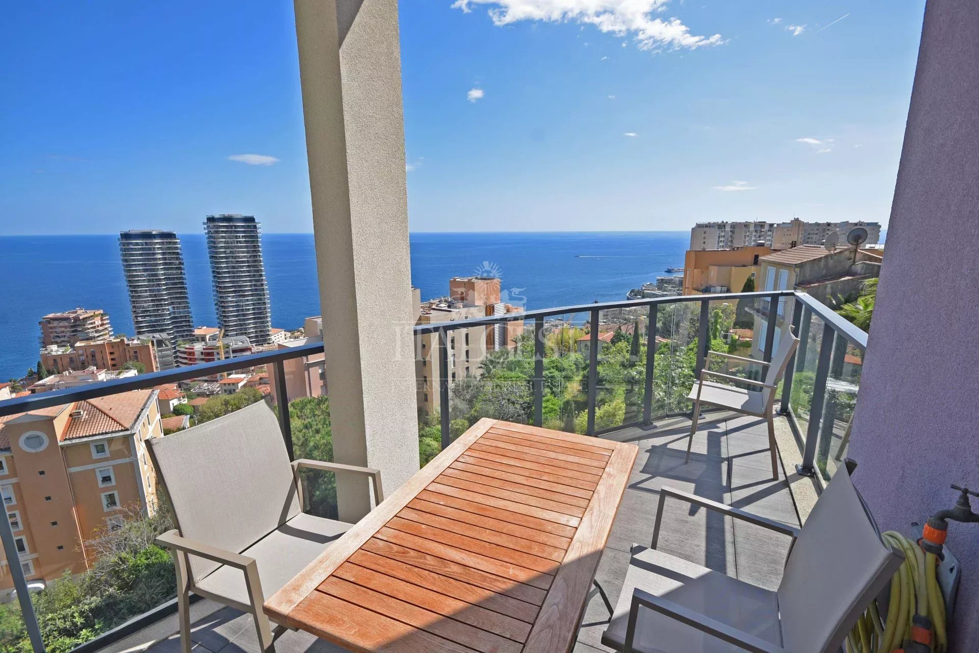 The modern apartment consists of a large corner living room with open-plan kitchen, large windows allowing panoramic views over Monaco and the sea, with access to the terrace, two bedrooms, two full bathrooms plus a guest WC. Air conditioning in every room, bioclimatic pergola on the terrace, two covered private parking spaces and a cellar.