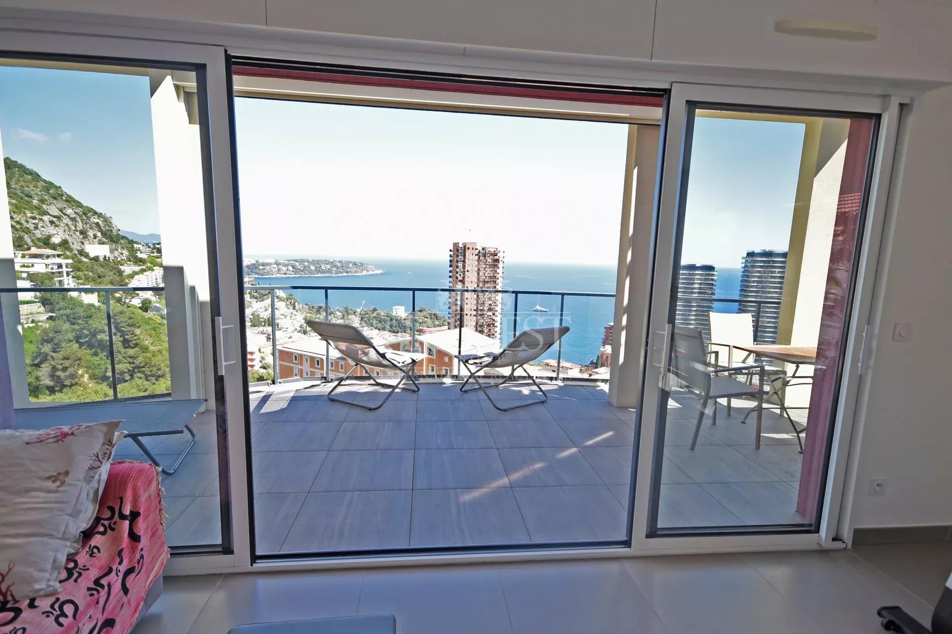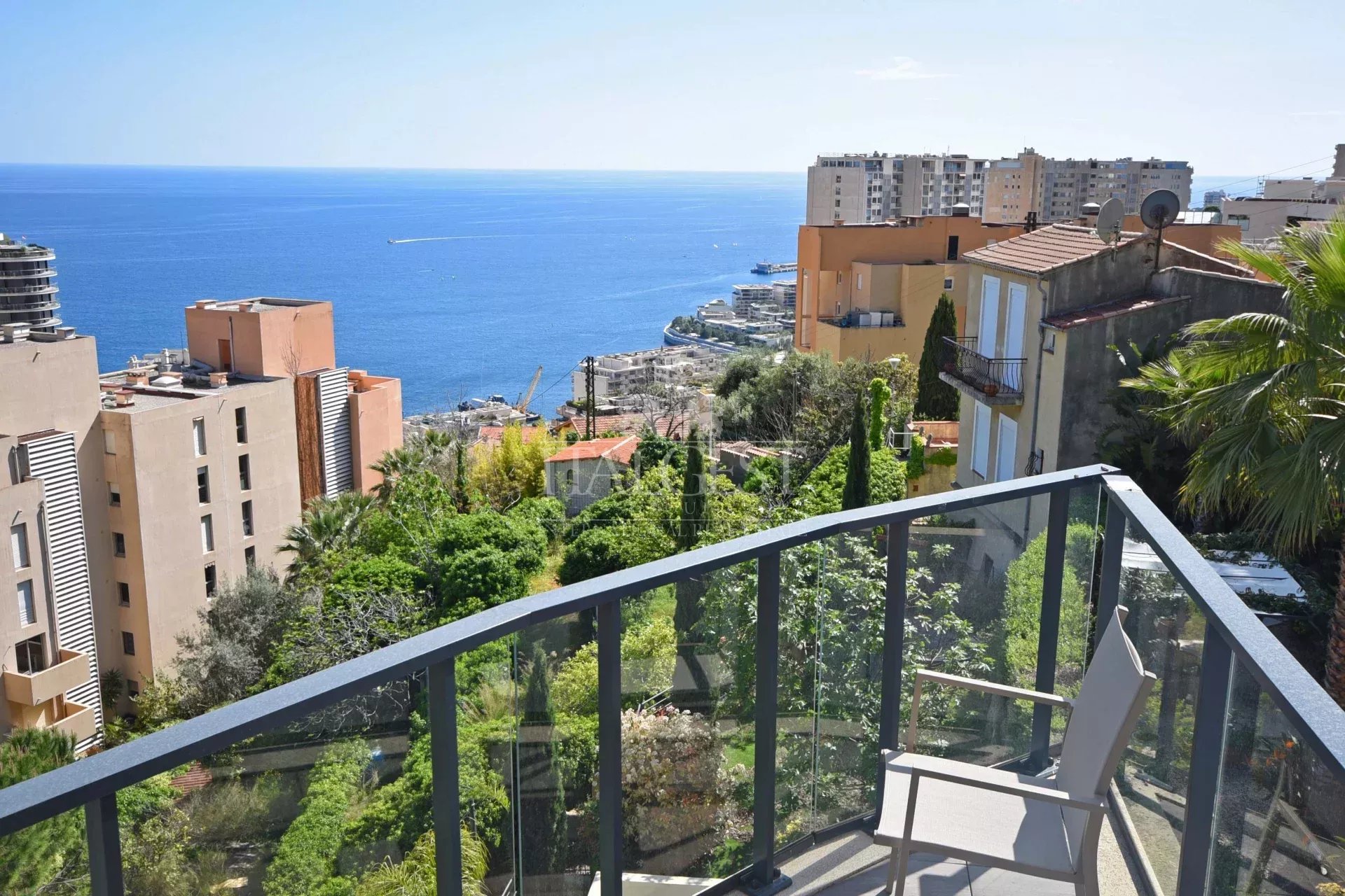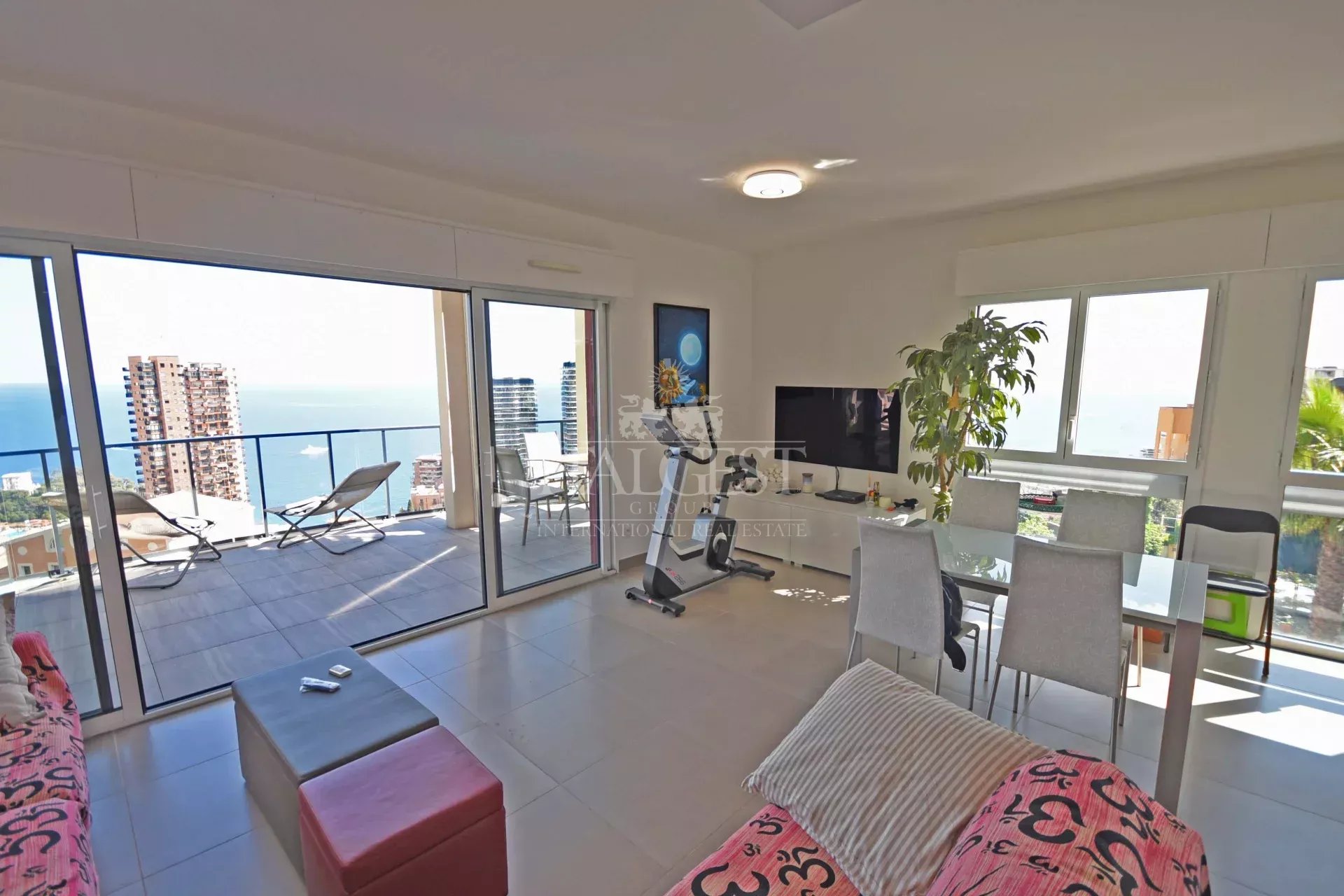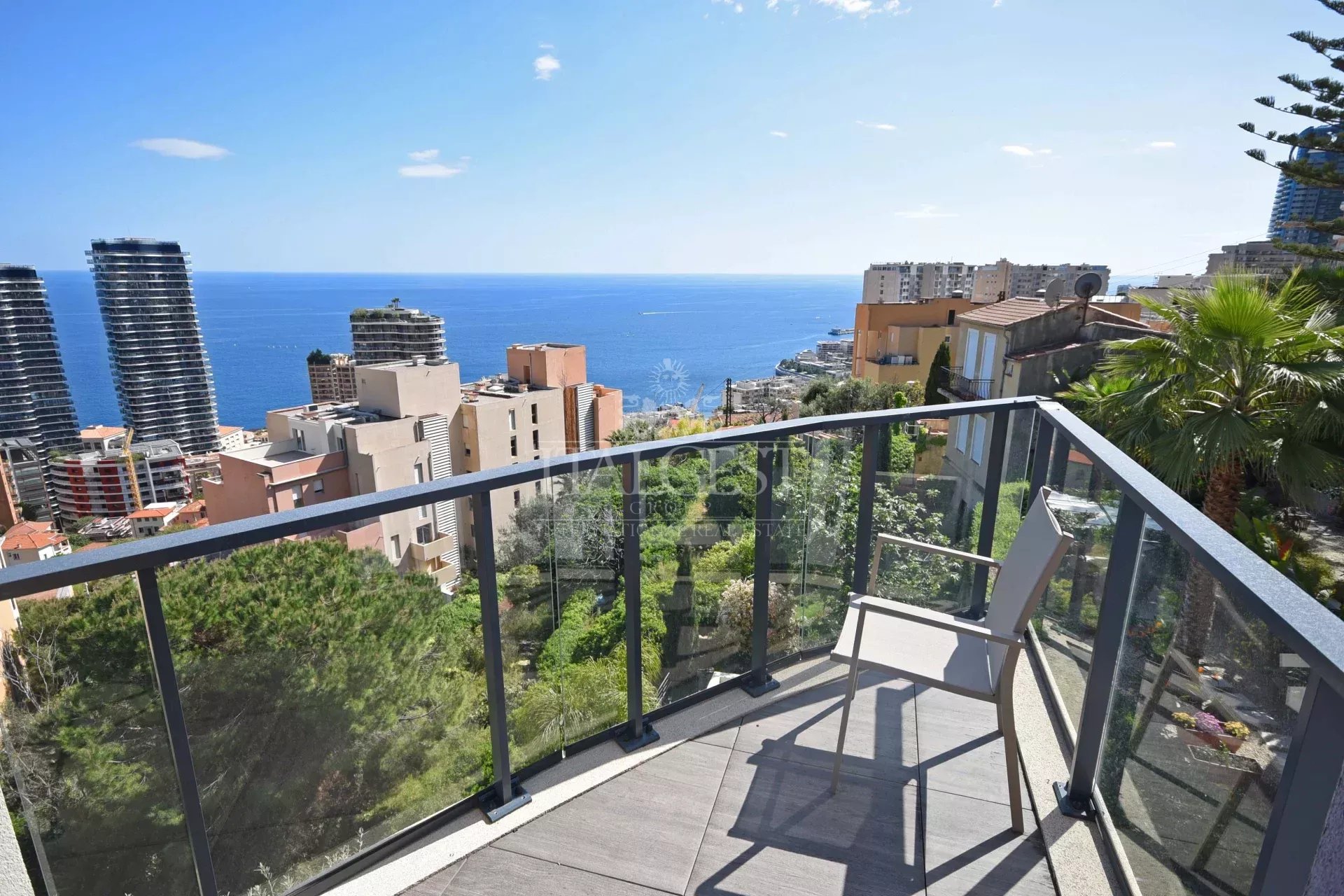 The modern apartment consists of a large corner living room with open-plan kitchen, large windows allowing panoramic views over Monaco and the sea, with access to the terrace, two bedrooms, two full bathrooms plus a guest WC. Air conditioning in every room, bioclimatic pergola on the terrace, two covered private parking spaces and a cellar.