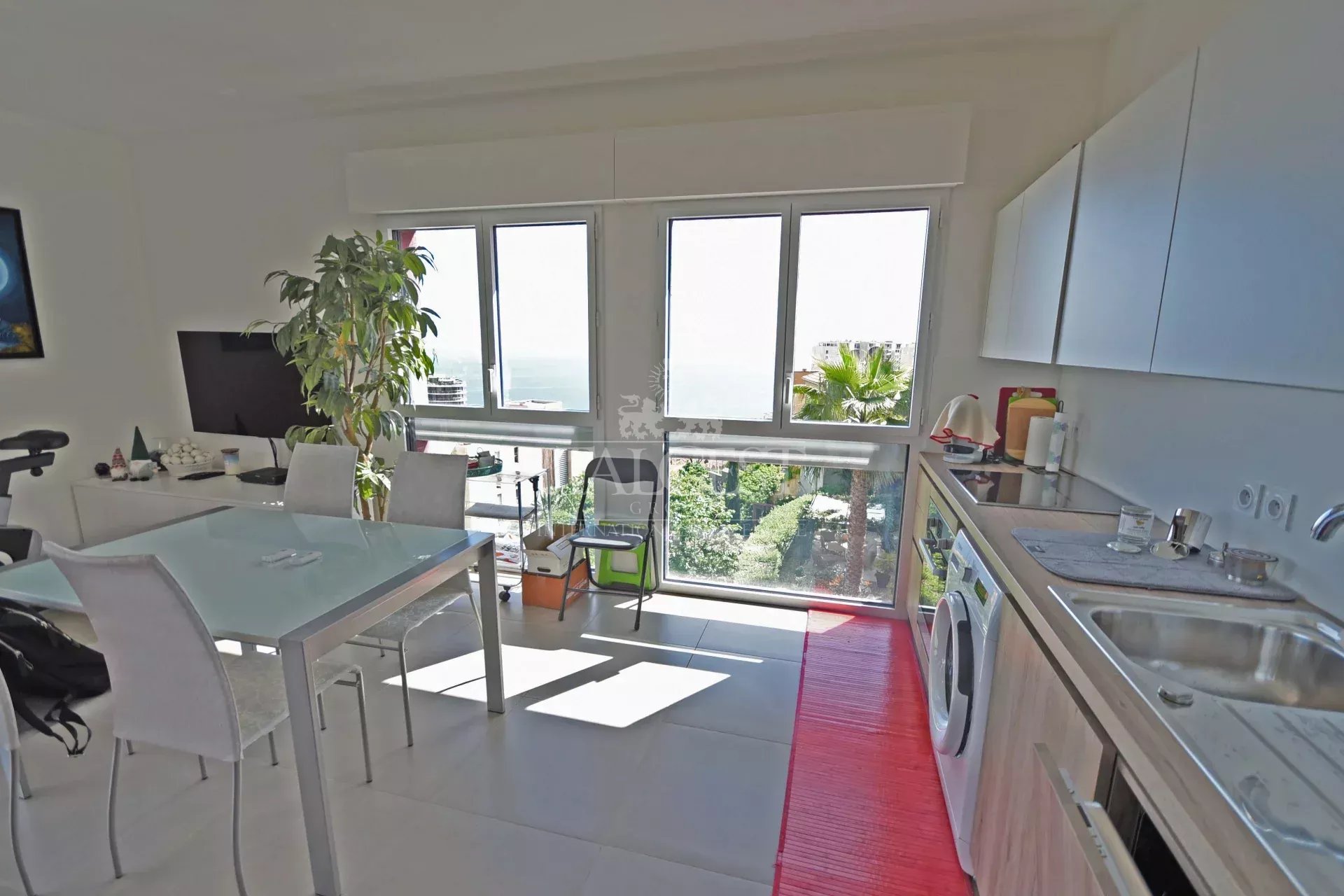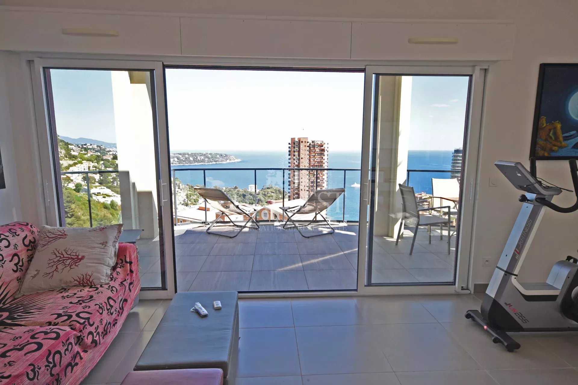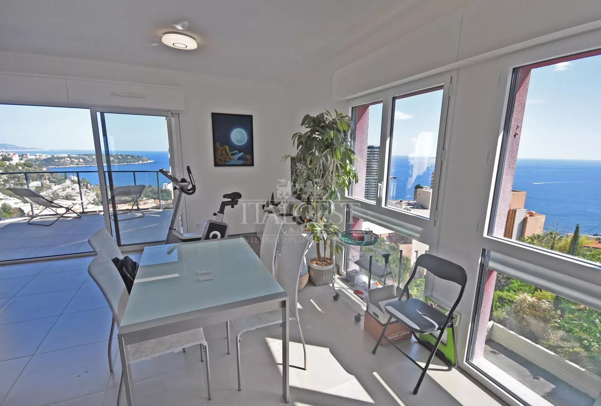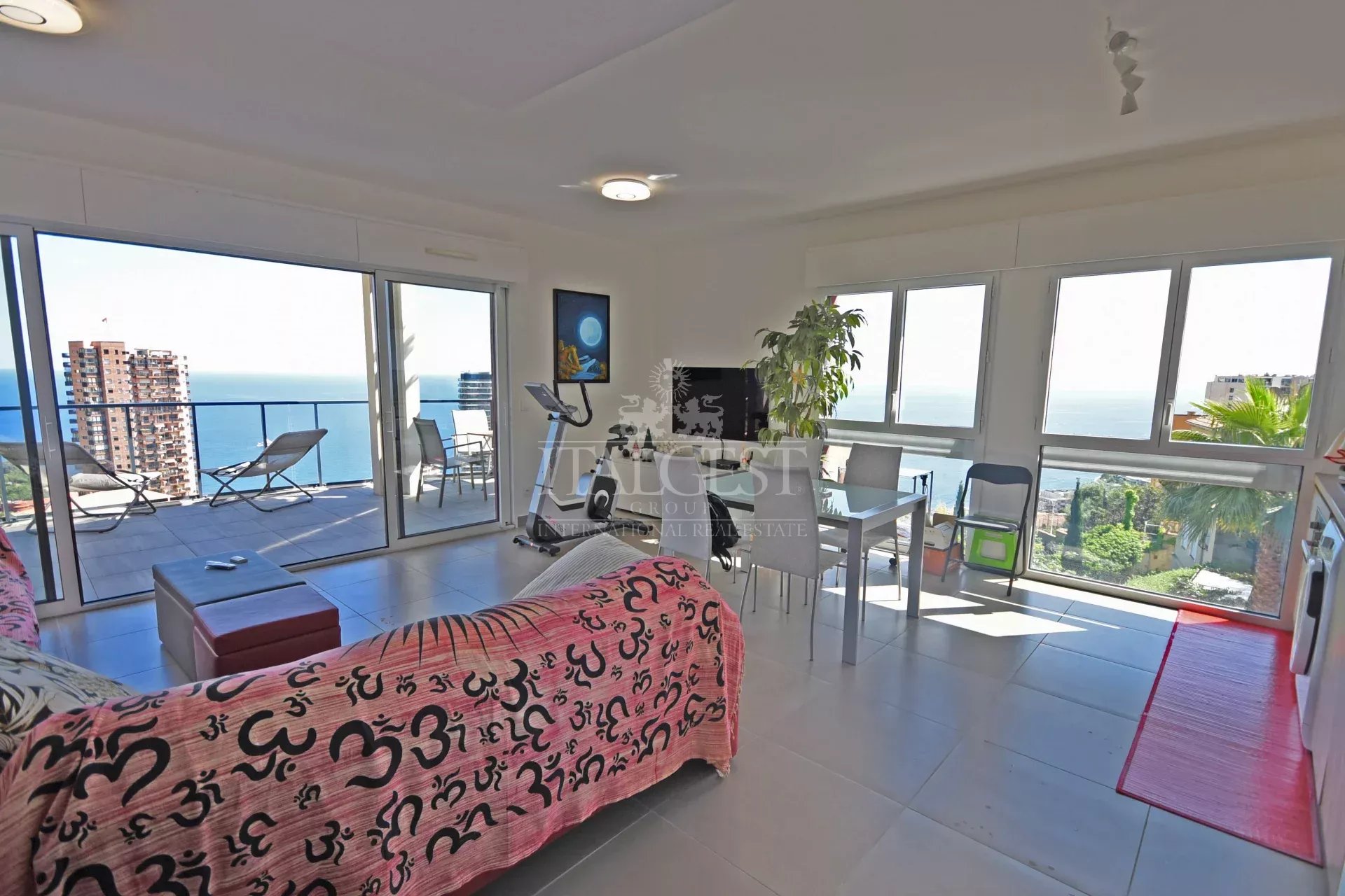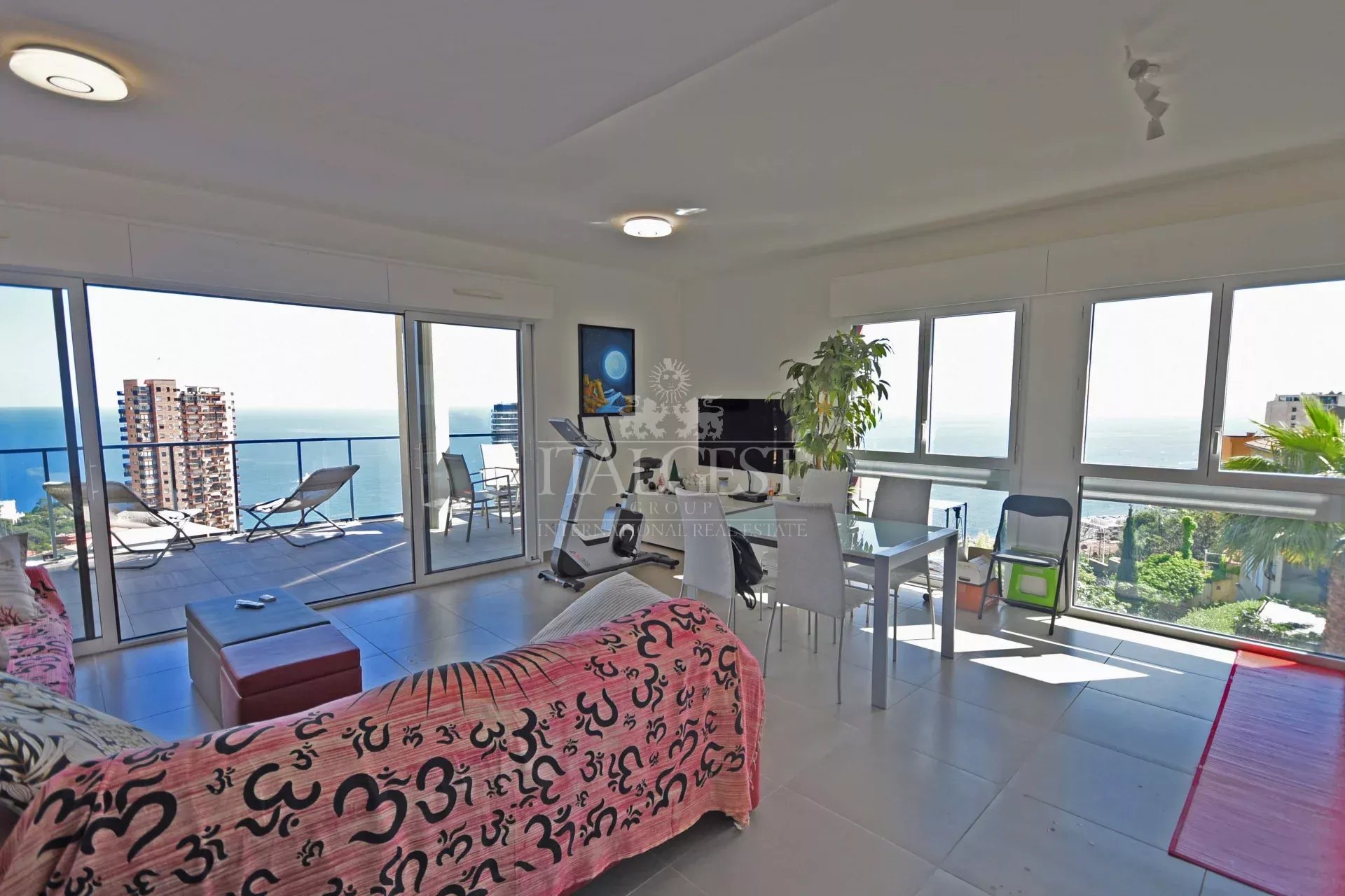 The modern apartment consists of a large corner living room with open-plan kitchen, large windows allowing panoramic views over Monaco and the sea, with access to the terrace, two bedrooms, two full bathrooms plus a guest WC. Air conditioning in every room, bioclimatic pergola on the terrace, two covered private parking spaces and a cellar.