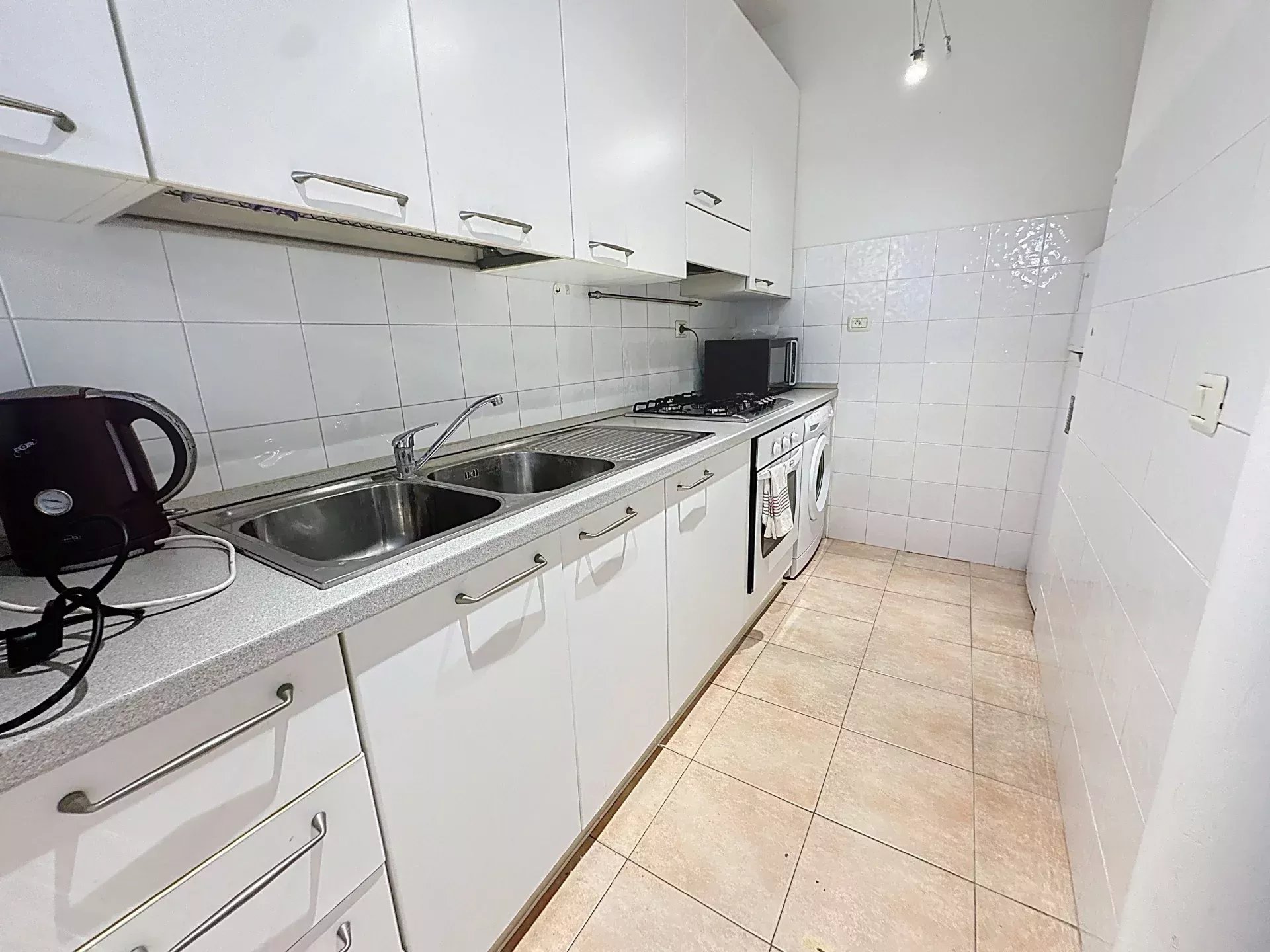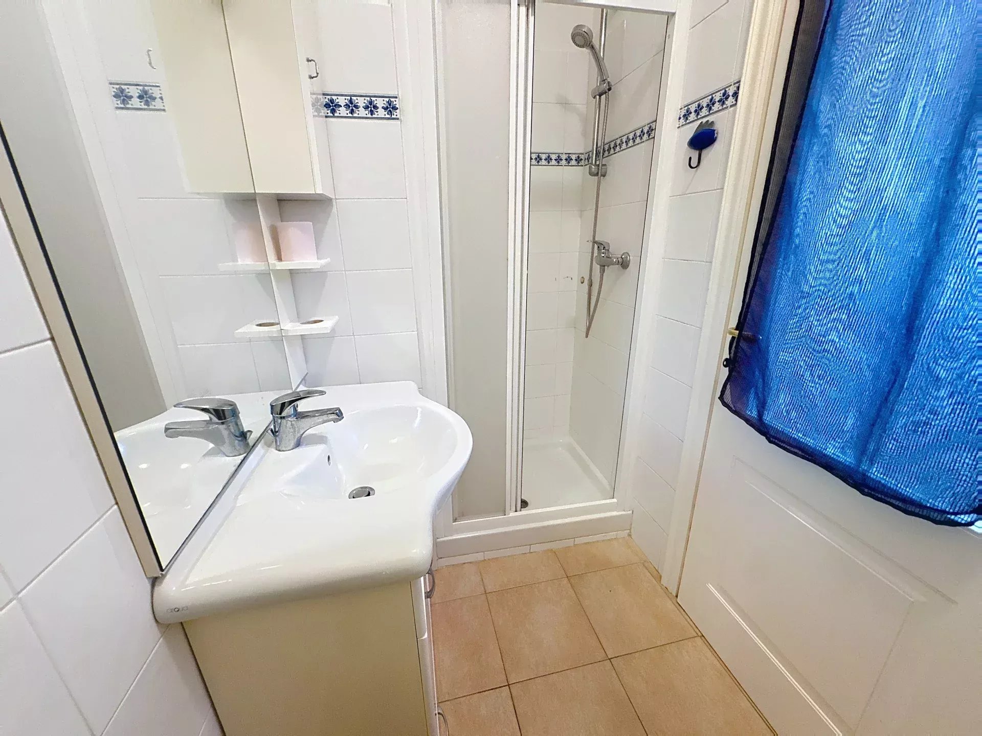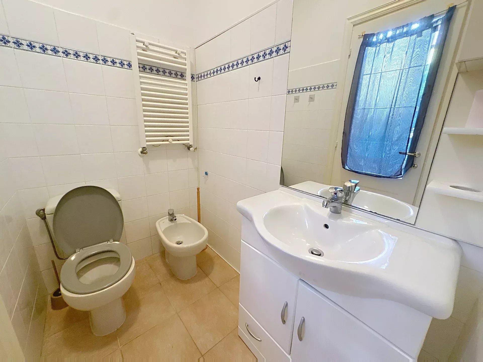 The apartment features high ceilings that enhance the sense of space and light. The living room is spacious and welcoming, the semi-open kitchen is functional, and the master bedroom offers a quiet and peaceful retreat. The bathroom, with a window, is well laid out and includes a shower, toilet, and bidet.
